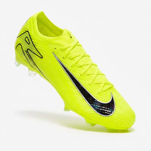 Le Nike Mercurial Superfly n’utilise pas d’œillets classiques, mais de fins canaux de laçage intégrés directement dans la tige. Cette conception permet de répartir la tension uniformément sur tout le cou-de-pied, assurant un ajustement précis sans points de pression. La laceture décentrée (« off-centred lacing ») est également caractéristique : elle libère la zone de frappe, offrant une surface lisse pour un meilleur toucher de balle et un meilleur contrôle.